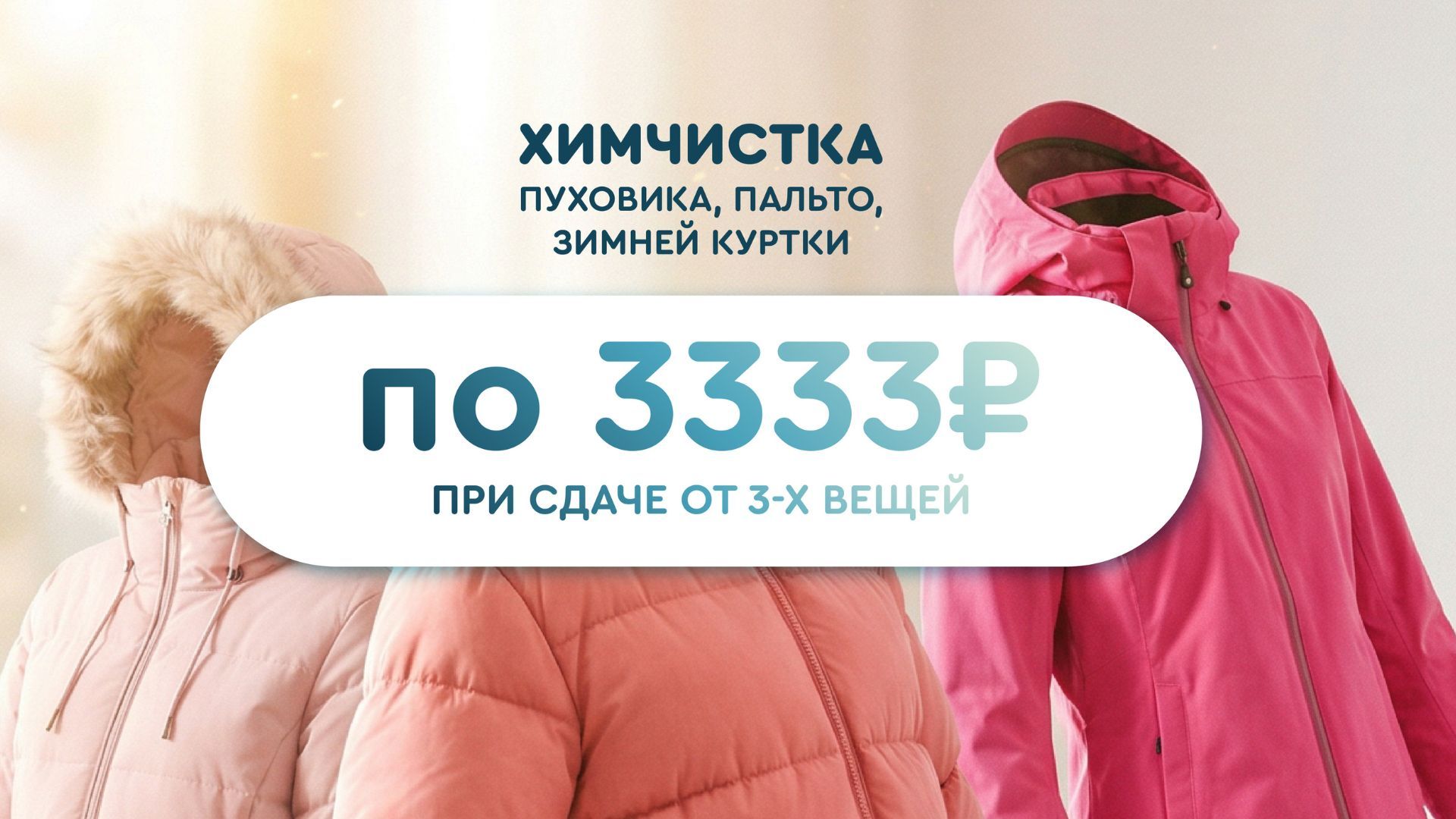 Весь апрель — специальная цена на чистку пуховиков, зимних курток и пальто всего по 3333 рубля за изделие при сдаче от 3-х вещей!