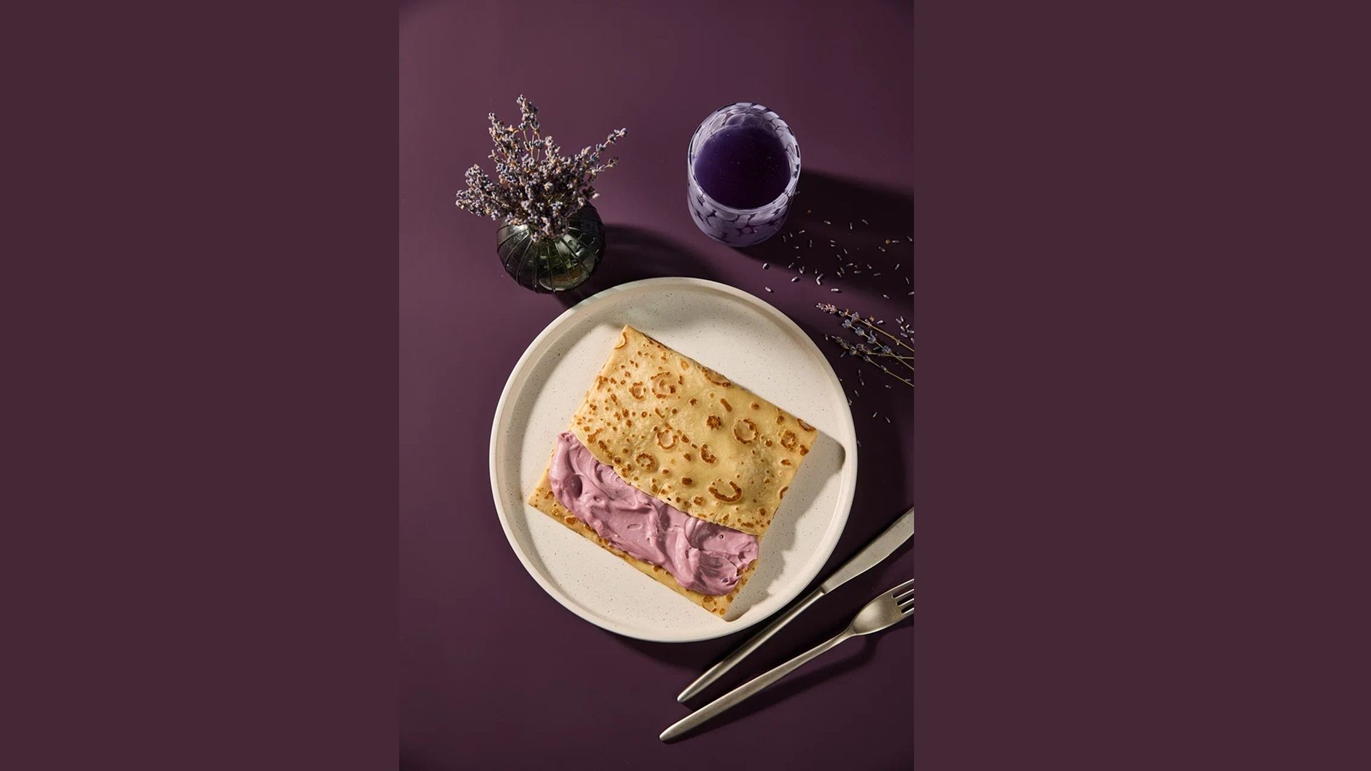 Тонкий горячий блин с шелковистым заварным кремом получается мягким и насыщенным, а натуральная лаванда добавляет цветочный оттенок и делает вкус более выразительным, сохраняя баланс и легкость.*